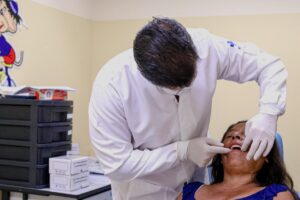Na foto de capa, mostra Katia recebendo a prótese dentária no CEM.