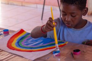 #ParaTodosVerem: As imagens mostram crianças e adolescentes na oficina de pintura.