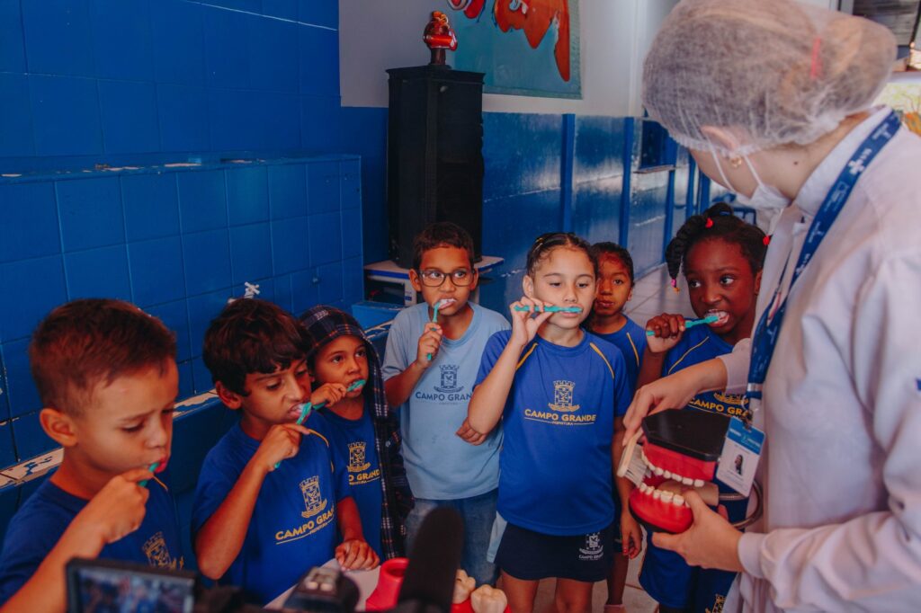 A mobilização também reforça a integração entre saúde e educação, reconhecendo a escola como espaço estratégico para a promoção de hábitos saudáveis. Além dos atendimentos de hoje, as equipes realizam atividades educativas, como palestras e orientações sobre escovação correta.