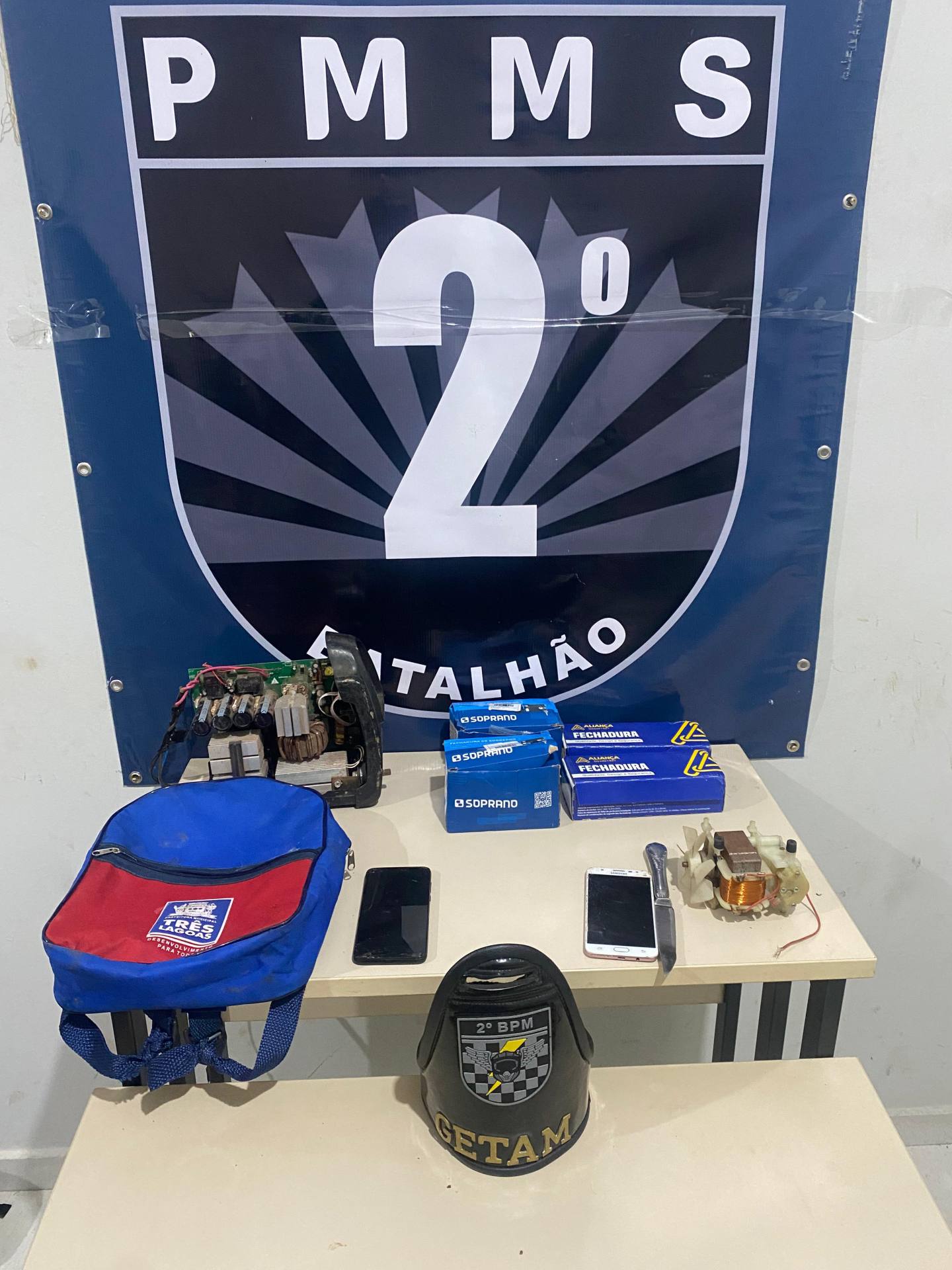 Durante o atendimento da ocorrência o masculino de 45 anos, que possuía um mandado de prisão em seu desfavor, e foi apontado pela detida como receptador dos objetos foi detido e em sua residência os policiais recuperaram 1 máquina de solda, 4 fechaduras para porta, 1 ventoinha com rolo de fio de cobre.
