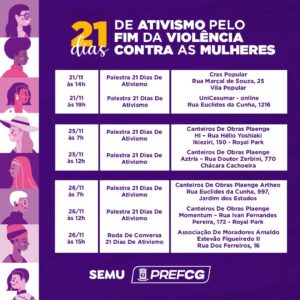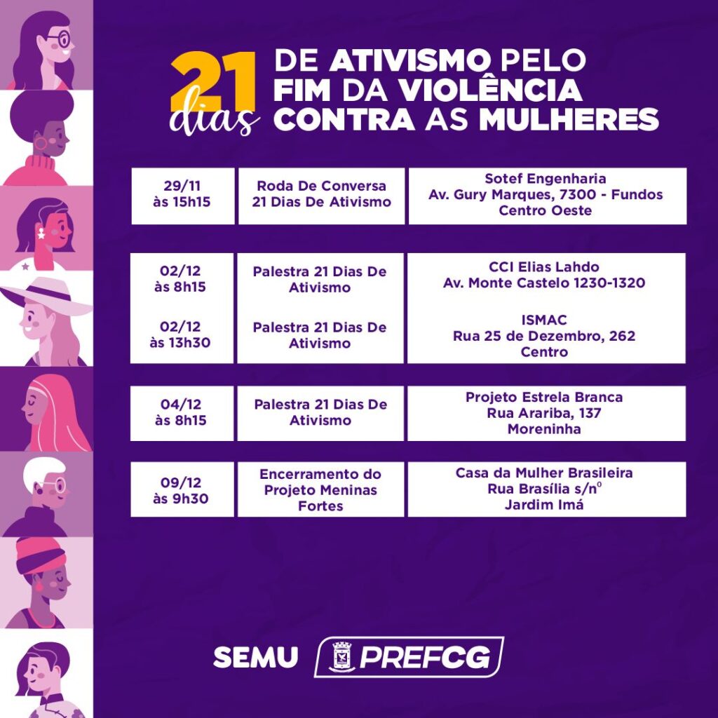 A Campanha Internacional 21 Dias de Ativismo pelo Fim da Violência contra as Mulheres é realizada em diversos países entre os dias 25 de novembro e 10 de dezembro, período que abrange datas históricas marcantes na luta pelos direitos das mulheres, somando os 16 Dias de Ativismo pelo Fim da Violência contra as Mulheres.