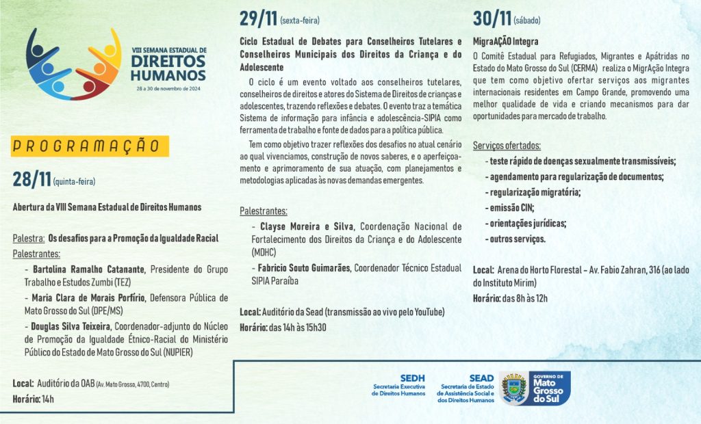 Com temas que vão desde a igualdade racial até o fortalecimento de políticas para crianças e adolescentes, a Semana Estadual de Direitos Humanos reafirma o compromisso de Mato Grosso do Sul com a construção de uma sociedade mais justa e inclusiva.