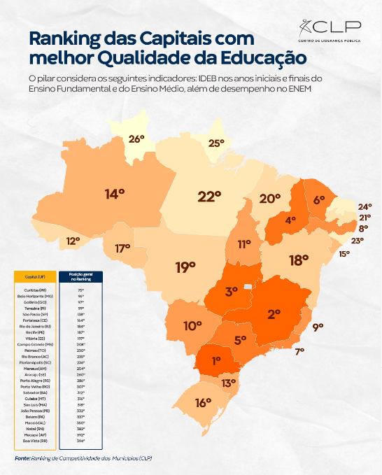 Campo Grande está em 10º lugar no Ranking de Qualidade da Educação entre as capiais brasileiras, avançando 9 posições em relação à análise anterior. Os dados são do Centro de Liderança Pública (CLP), responsável por avaliar a competitividade dos municípios brasileiros no Ranking de Competitividade dos Municípios.
