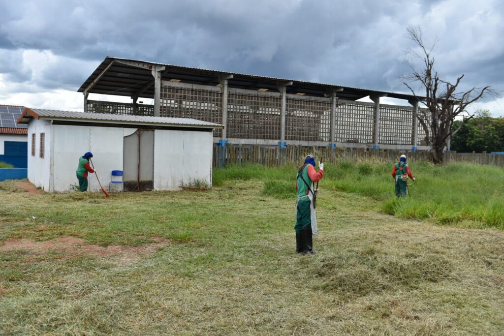 #ParaTodosVerem A imagem de capa mostra os uniformes que serão entregues aos alunos. A primeira foto interna também mostra os uniformes em cima de uma mesa. A próxima imagem é de equipes limpando o terreno de uma das escolas e a última foto mostra um trabalhador executando a roçada em uma escola municipal.