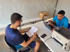 Fotocapa: Agente da Funsat em atendimento a um homem interessado em vagas de trabalho.