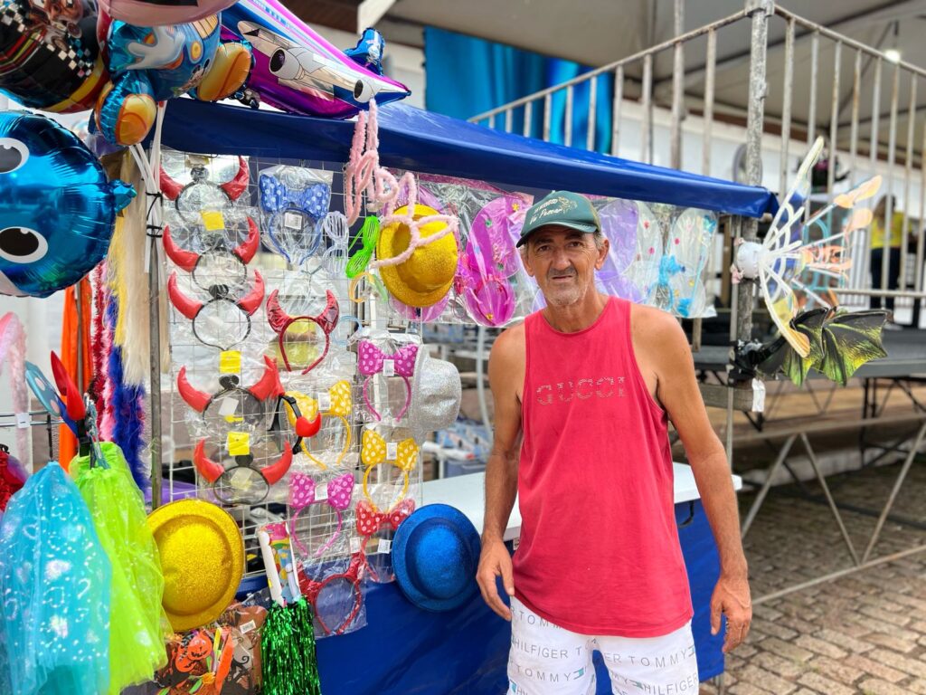 Pedro Luciano Sanchis aproveita todos os anos para alavancar as vendas com barraca de fantasias e de bebida. “Todo carnaval a gente vem. Às vezes sobra alguma coisa, mas a maior parte dos produtos a gente vende. Muita gente vem despreparada, acaba comprando na hora. O pessoal esquece, se empolga aqui no meio da festa, resolve se fantasiar e leva.”