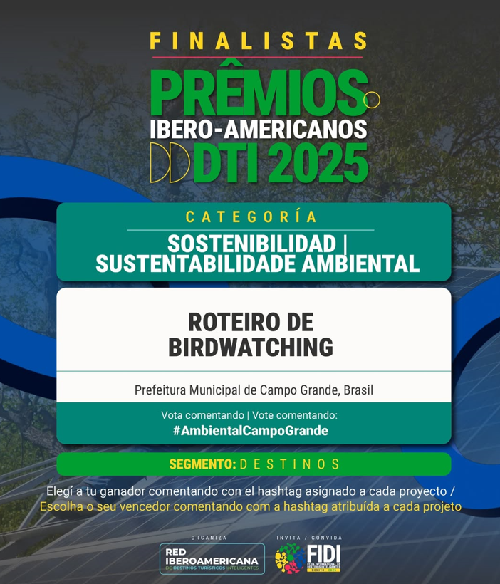 Você já garantiu o voto de Campo Grande para o Prêmio Ibero-Americano de Destino Turístico Inteligente 2025. A Capital de Mato Grosso do Sul é finalista em duas categorias: GOVERNANÇA e SUSTENTABILIDADE AMBIENTAL, com o Aplicativo Conecta Campo Grande e o Roteiro de Birdwatching (Observação de Aves).