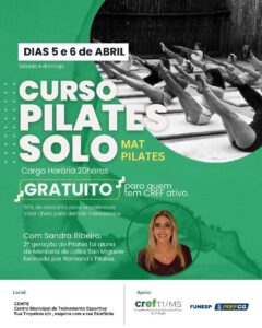 A Prefeitura de Campo Grande, por meio da Fundação Municipal de Esportes (Funesp), firmou parceria com o Conselho Regional de Educação Física de Mato Grosso do Sul (CREF11/MS) e o Instituto Sandra Ribeiro para ampliar o acesso ao curso de atualização em Pilates no Solo – “Mat Pilates”. A capacitação é destinada a professores da Funesp e profissionais de educação física. As inscrições já estão abertas.