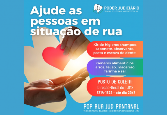Encerra nesta quinta-feira, dia 20 de março, a arrecadação de materiais de higiene pessoal e gêneros alimentícios para pessoas em situação de rua. A coleta integra o Pop Rua Jud Pantanal, projeto de iniciativa da Justiça Federal que o Tribunal de Justiça de Mato Grosso do Sul está colaborando como parceiro.