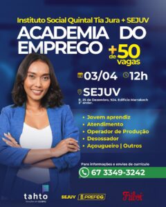 A Secretaria-Executiva da Juventude (SEJUV), em parceria com o Instituto Social Quintal Tia Jura, promove nesta quinta-feira (3), a partir das 12h, a “Academia do Emprego”, uma feira com 50 vagas de trabalho disponíveis para jovens em busca de uma oportunidade no mercado de trabalho. O evento ocorrerá na sede da SEJUV e visa ampliar as chances de empregabilidade, especialmente para aqueles que estão começando sua carreira profissional.