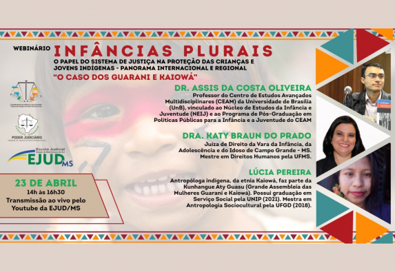 No dia 23 de abril, a Escola Judicial de Mato Grosso do Sul (Ejud-MS), em parceria com a Coordenadoria da Infância e da Juventude, realizará um webinário destinado a magistrados e servidores. A formação será das 14 horas às 16h30 e terá o tema “Infâncias Plurais: O papel do sistema de justiça na proteção das crianças e jovens indígenas – panorama internacional e regional ‘o caso dos Guarani e Kaiowá’”.