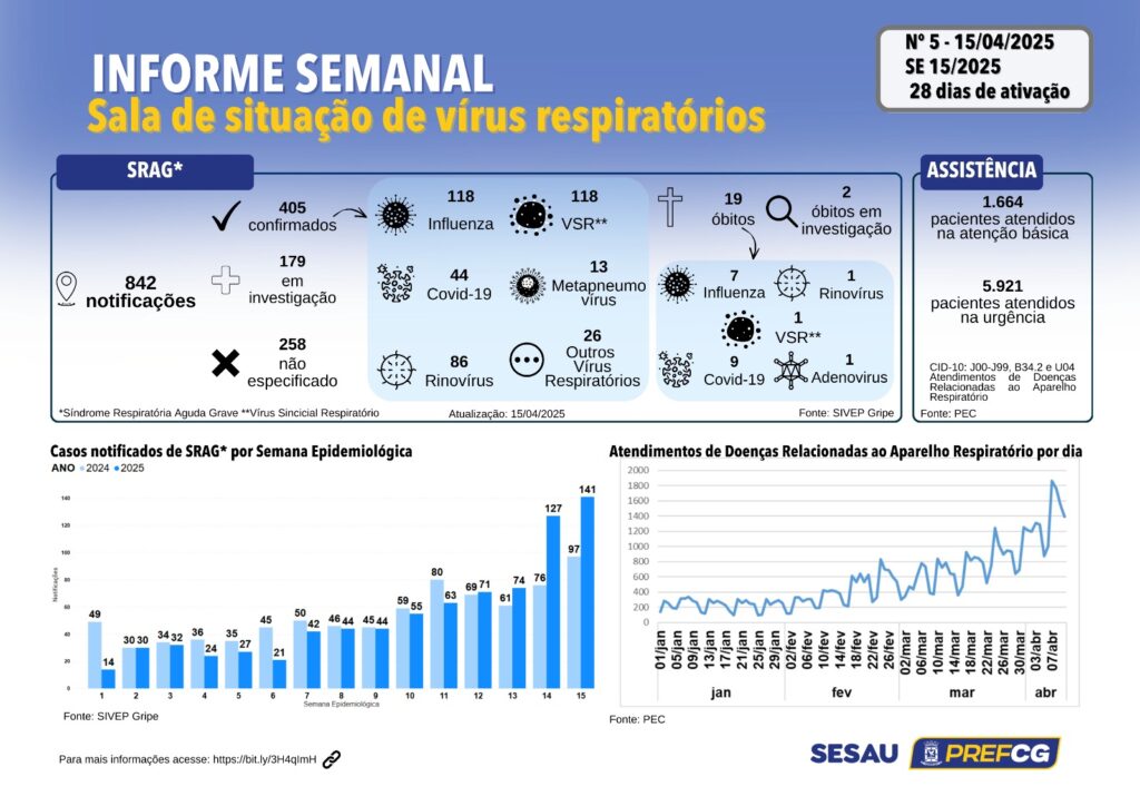 Conforme o último boletim epidemiológico divulgado pela Sala de Situação da Sesau (15/04), Campo Grande já contabiliza 842 notificações de SRAG em 2025, com 405 casos confirmados e 19 óbitos.