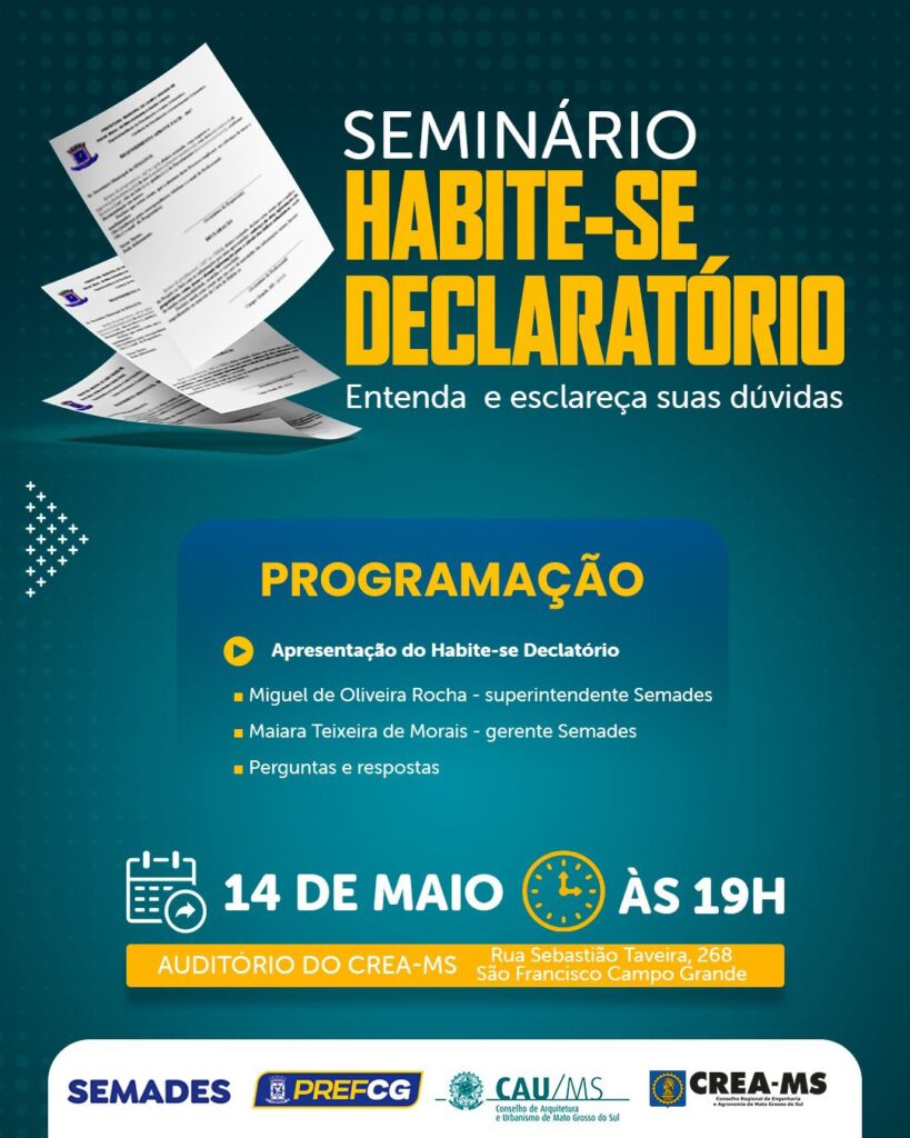 A Prefeitura de Campo Grande, por intermédio da Secretaria Municipal de Meio Ambiente, Gestão Urbana e Desenvolvimento Econômico, Turístico e Sustentável (Semades), em parceria com o Conselho Regional de Engenharia e Agronomia de Mato Grosso do Sul (CREA-MS) e o Conselho de Arquitetura e Urbanismo de Mato Grosso do Sul (CAU/MS), promovem no dia 14 de maio, às 19h, no Auditório CREA-MS o Seminário Habite-se Declaratório.