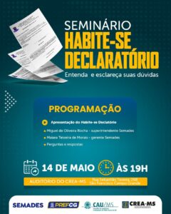 A Prefeitura de Campo Grande, por intermédio da Secretaria Municipal de Meio Ambiente, Gestão Urbana e Desenvolvimento Econômico, Turístico e Sustentável (Semades), em parceria com o Conselho Regional de Engenharia e Agronomia de Mato Grosso do Sul (CREA-MS) e o Conselho de Arquitetura e Urbanismo de Mato Grosso do Sul (CAU/MS), informa que as inscrições são limitadas e restam as últimas vagas para o Seminário Habite-se Declaratório, que será realizado na quarta-feira, dia 14 de maio, às 19h, no Auditório do CREA-MS.