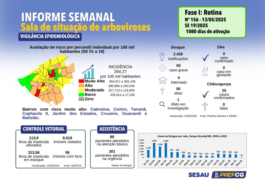 De acordo com o Informe Semanal nº 156 da Sala de Situação de Arboviroses, referente à Semana Epidemiológica 19 (de 04 a 10 de maio), Campo Grande registrou 2.439 notificações de dengue, sem casos graves, internações ou óbitos confirmados, mas com um óbito ainda em investigação. Não houve registro de casos de zika no período. Em relação à chikungunya, foram confirmados 25 casos, sem óbitos. A taxa de incidência geral está em 264,27 casos por 100 mil habitantes.
