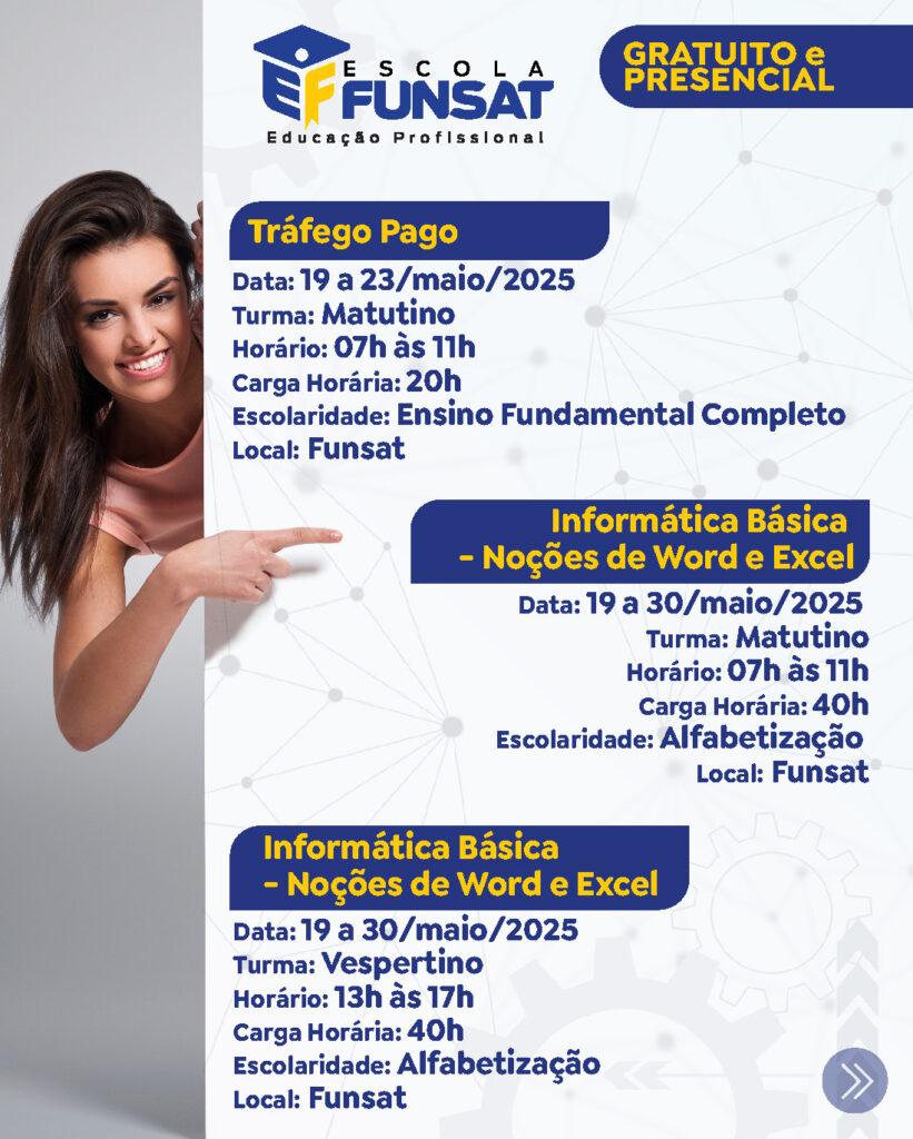 Além desse treinamento, pelo programa Qualifica, outros cinco cursos iniciam neste mês na Escola Funsat. Veja abaixo a relação dos grupos abertos para os cursos de maio, que terão atividades dentro da Escola Funsat, na Rua 14 de Julho, 992, na Vila Glória: