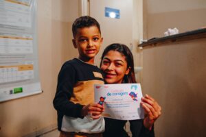 PraTodosVerem: Fotografia de um menino e sua mãe sorrindo para a câmera dentro de uma unidade de saúde. O menino, de pele clara e cabelo curto, veste um moletom azul com detalhes em bege e branco, e segura um “Certificado de Coragem”. A mãe, agachada ao lado dele, também sorri e segura o certificado junto com o filho. Ao fundo, é possível ver parte de um balcão, uma pia e um cartaz fixado na parede com informações técnicas. O ambiente tem iluminação interna amarelada.