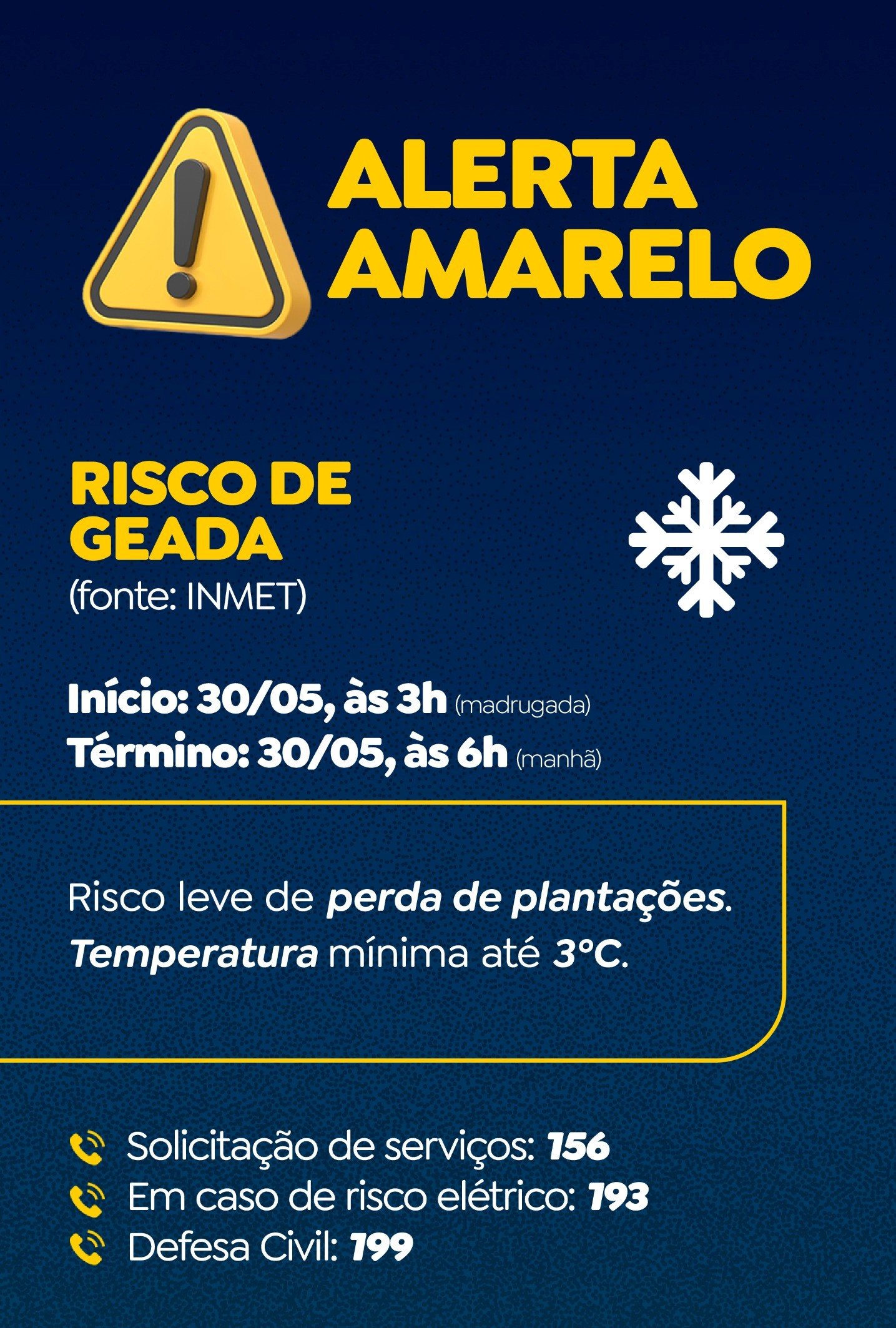 A Coordenadoria Municipal de Proteção e Defesa Civil (Compdec) informa que o Instituto Nacional de Meteorologia (INMET) emitiu Alerta Amarelo para risco de geada na Capital com registro de temperatura na casa dos 3ºC. O aviso meteorológico tem início às 3h desta sexta-feira (30) e término às 6h do mesmo dia.