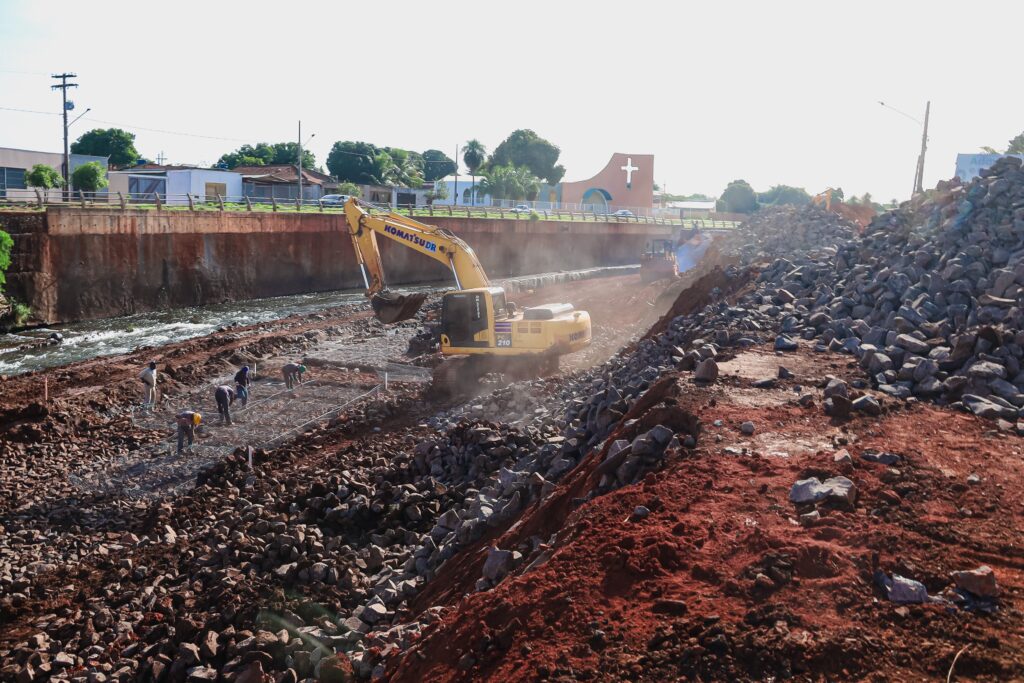 #PraTodosVerem: A imagem mostra as obras de contenção de erosão no córrego Anhanduí, em Campo Grande. No centro da cena, escavadeiras e máquinas pesadas trabalham sobre uma estrutura de gabiões — blocos formados por pedras revestidas com telas de aço — instaladas às margens do córrego. O solo vermelho indica a movimentação recente de terra. À direita, vê-se o curso d’água fluindo em meio ao canteiro de obras. Ao fundo, há casas, comércios e o tráfego urbano na região da Avenida Ernesto Geisel. O céu está claro e o dia é ensolarado.