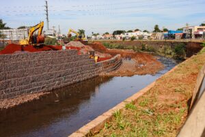 Para proteger a margem do córrego contra processos erosivos, está sendo utilizado o sistema gabião, que demanda técnica especializada e execução cuidadosa. Inicialmente, é feito o preparo do colchão com pedra britada, seguido da instalação das gaiolas metálicas. As pedras, que devem estar limpas, secas e livres de impurezas, são encaixadas manualmente uma a uma dentro dessas estruturas.