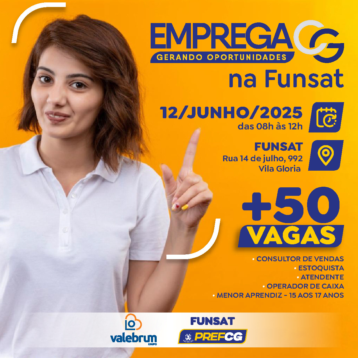 Dando sequência ao cronograma do Emprega CG, a Funsat realiza nesta quinta-feira (12), a partir das 8h, novo processo seletivo para o Grupo Valebrum/Boticário, com 50 vagas distribuídas em cinco funções: consultor de vendas, estoquista, atendente, operador de caixa e menor aprendiz (para candidatos entre 15 e 17 anos).