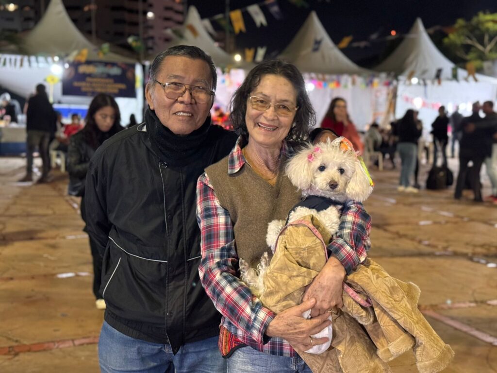 Mas não foi só a juventude que apareceu, não. A dona Isabel, de 68 anos, foi com o esposo e ainda levou a Mel, a cadelinha da família. “Ano passado viemos e gostamos. Este ano estamos aqui de novo. Aproveitamos de tudo um pouco, as barracas com as comidas típicas e os shows. É um momento de descontração”, disse ela, animada.