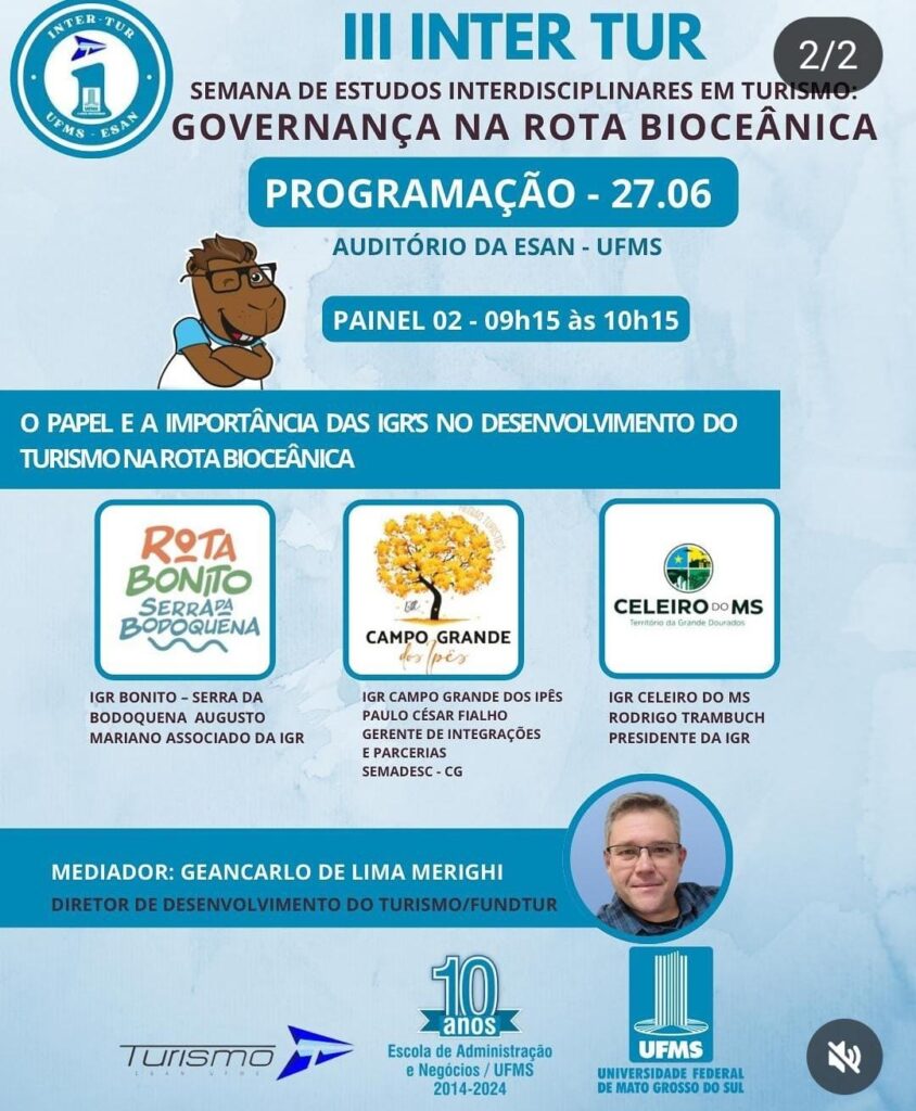 O segundo painel, com início às 9h15, terá como tema central “O papel e a importância das IGRs no desenvolvimento do turismo na Rota Bioceânica”. O gerente de Integração e Parcerias da Secretaria Municipal de Meio Ambiente, Gestão Urbana e Desenvolvimento Econômico, Turístico e Sustentável (Semades), Paulo César Fialho, participa como porta-voz da IGR Campo Grande dos Ipês, reforçando o protagonismo da capital na articulação de políticas e ações turísticas ligadas à rota.