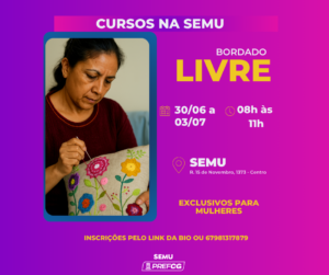 A Prefeitura de Campo Grande, por meio da Secretaria Executiva da Mulher (Semu), abre inscrições para o curso gratuito de Bordado Livre, voltado exclusivamente para mulheres. A capacitação acontece nos dias 30 de junho, 1º, 2 e 3 de julho, das 8h às 11h, na Escola de Capacitação para Mulheres (Escap Semu), localizada na sede da secretaria, na Rua 15 de Novembro, 1373 – Centro.