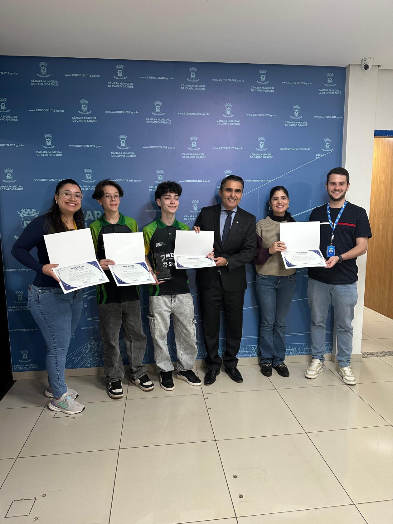 A Câmara Municipal de Campo Grande abriu suas portas nesta quarta-feira (26) para uma homenagem especial aos alunos e professores da equipe BR Racing, do SESI de Dourados, vencedora de uma competição internacional de robótica realizada em Abu Dhabi, nos Emirados Árabes Unidos. A iniciativa foi proposta pelo vereador Herculano Borges (Republicanos), membro da Comissão de Educação da Casa.