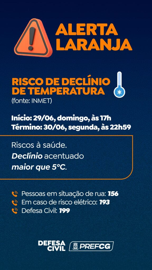A Defesa Civil Municipal informa que o Instituto Nacional de Meteorologia (INMET) emitiu Alerta Laranja para risco de declínio de temperatura em Campo Grande. O aviso meteorológico tem início às 17h deste domingo (29/06) e segue até às 22h59 de segunda-feira (30/06).