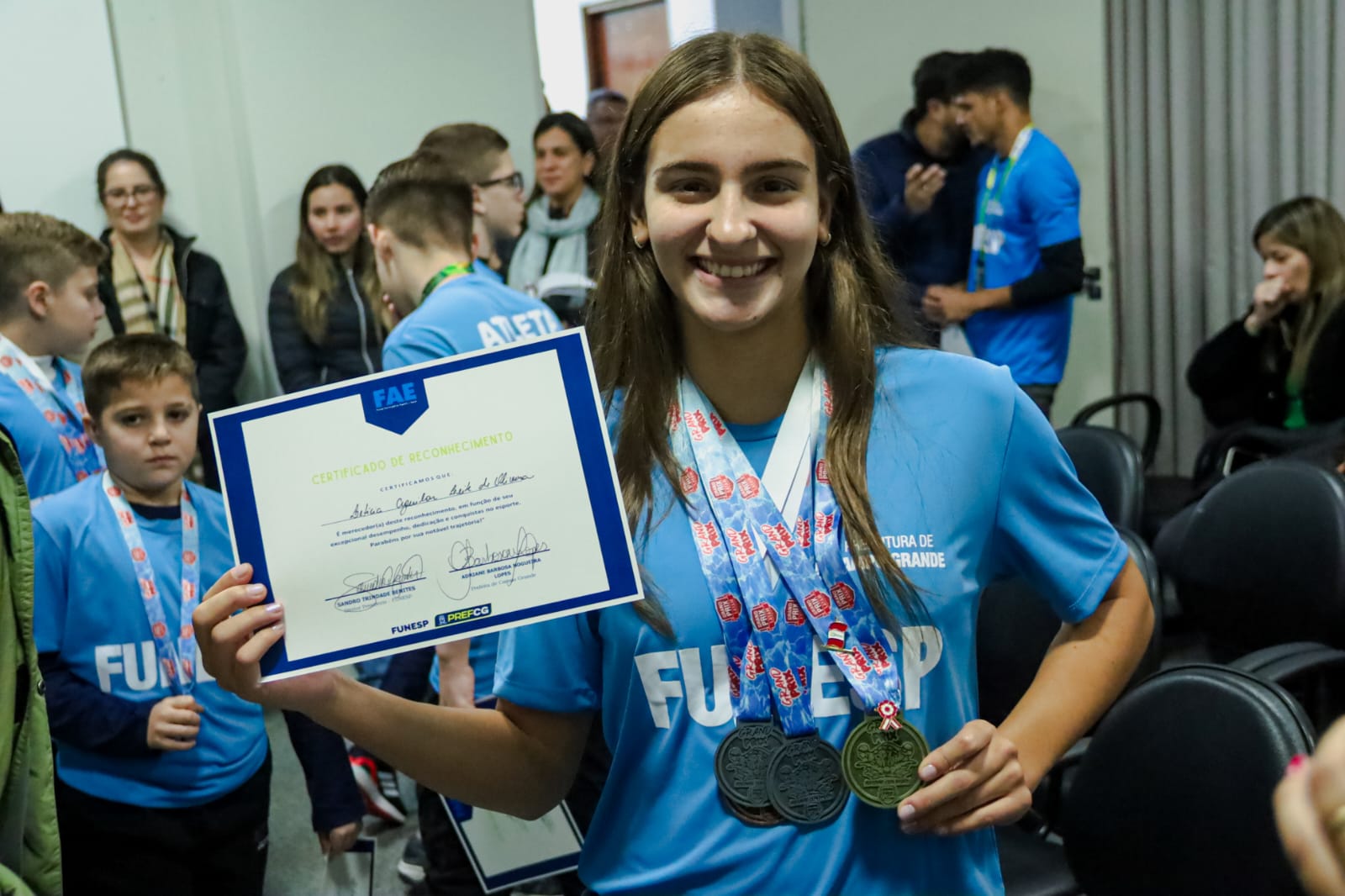 #PraTodosVerem: Na matéria há cinco fotos. A primeira, usada como capa, mostra os atletas homenageados, usando camisetas azuis com a escrita “Funesp” em caixa alta na frente e o brasão da prefeitura na região do peito, Eles estão acompanhados da prefeita Adriane Lopes, do secretário Sandro Benites, técnicos da Funes e de pais/responsáveis; a segunda imagem mostra a prefeita Adriane Lopes assinando um dos certificados de reconhecimento entregue aos esportistas; a terceira foto mostra a atleta Letícia Aguilar Leite de Oliveira sorrindo, com as medalhas conquistas no pescoço e segurando o certificado; a quarta imagem é do atleta Silas Rafael Cardoso Silva; a quinta fotografia mostra o atleta João Lucas Alves Duarte sorrindo ao lado da mãe Laiane Tássia Nunes Alves.