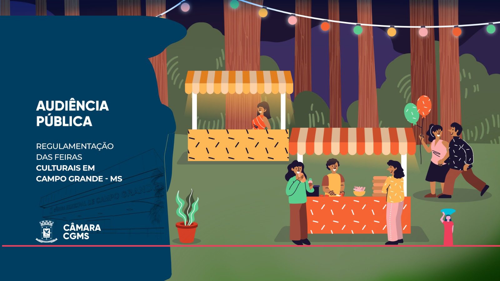 A Câmara Municipal de Campo Grande promove, na segunda-feira, dia 7, às 9 horas, Audiência Pública para falar sobre a regulamentação das Feiras Culturais. Os vereadores devem se reunir com representantes do poder público, feirantes, artistas, produtores e a população para construir de forma coletiva uma legislação que fortaleça esse espaço de convivência, empreendedorismo, geração de renda e valorização da cultura local, criando normas para essas feiras.