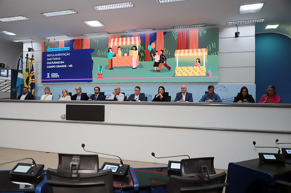 Feirantes e produtores culturais de feiras de Campo Grande foram ouvidos durante Audiência Pública promovida pela Câmara Municipal, na manhã desta segunda-feira, dia 7. Vereadores, representantes da prefeitura e do Estado discutem políticas públicas baseadas nas demandas apresentadas. O vereador Ronilço Guerreiro, proponente do debate, discute legislação específica sobre as feiras livres e culturais da Capital, buscando criar regulamentações, garantir incentivos e fomentar a economia criativa nesses espaços.
