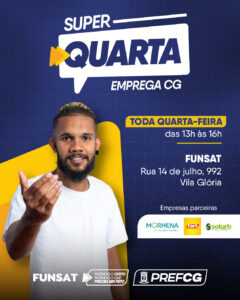 A tarde desta quarta-feira (9) terá mais uma edição do ‘Super Quarta’, projeto do Emprega CG que visa acelerar contratações de grandes parceiros da Funsat (Fundação Social do Trabalho). Com a ‘Super Quarta’, o público terá acesso a um mutirão que envolve 200 vagas, e uma perspectiva traçada para ocorrer uma contratação a cada três minutos.