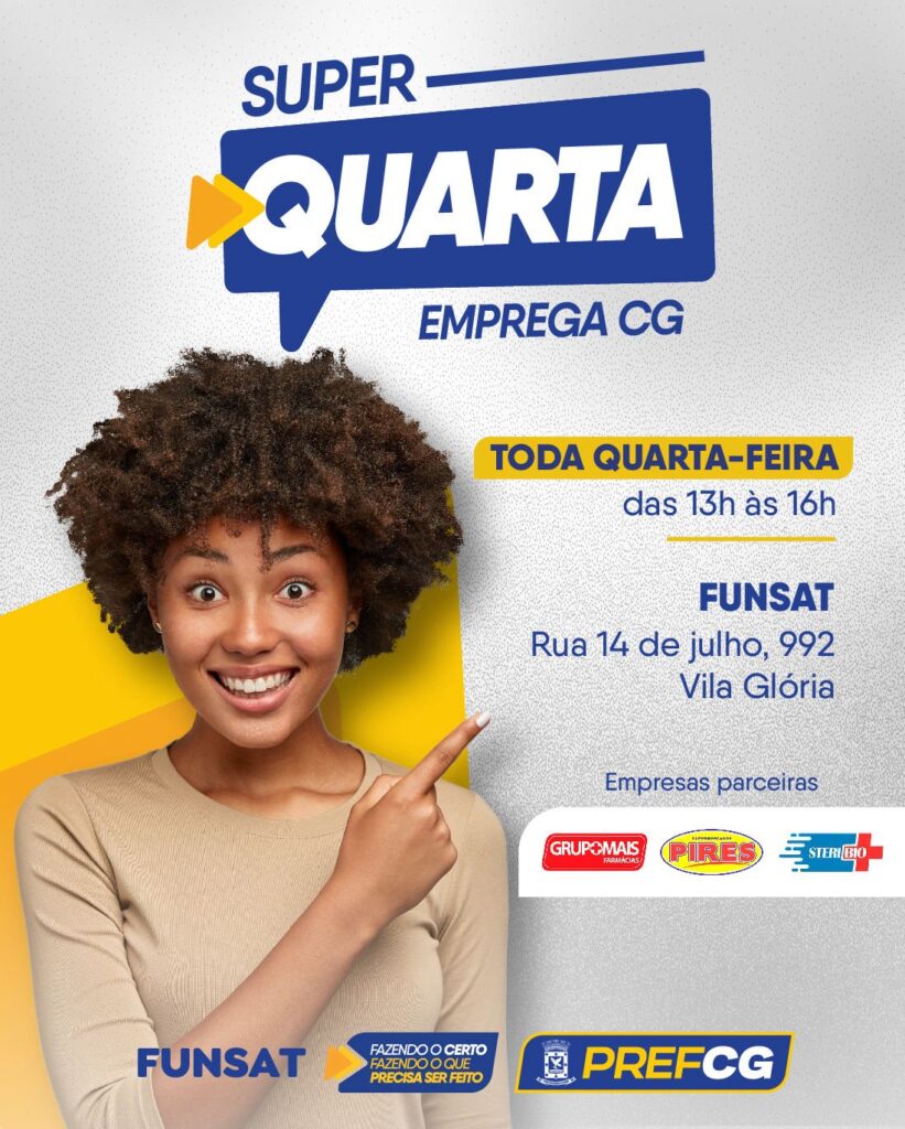 Na quarta-feira (16), também no período vespertino, o Emprega CG promove outra ação, com o projeto da “Super Quarta”, na sede da Funsat, entre as 13h e as 16h, no recrutamento de 200 vagas, de três anunciantes: Grupo Mais Farmácias, Steribio Esterilização e Supermercado Pires.