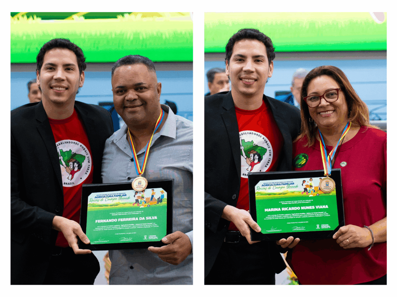 O vereador Jean Ferreira (PT) homenageou, nesta segunda-feira (14), dois agricultores do Movimento dos Trabalhadores Rurais Sem Terra (MST) com a Medalha “Agricultura Familiar – Raízes de Campo Grande”. A entrega foi realizada em sessão solene na Câmara Municipal. As medalhas foram entregues a Marina Ricardo Nunes Viana e Fernando Ferreira da Silva.