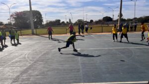Antes do início dos jogos, os facilitadores reuniram as equipes para explicar as regras e reforçar a proposta do evento, priorizando o respeito mútuo e o espírito esportivo. Apesar das orientações, a criançada entrou em quadra com seriedade — com direito a gritos de torcida e muita animação.