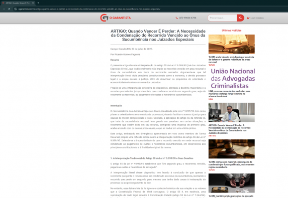 Com o título “Quando vencer é perder: a necessidade da condenação do recorrido vencido ao ônus da sucumbência nos Juizados Especiais”, o texto propõe uma nova leitura do artigo 55 da Lei nº 9.099/95, que rege os Juizados Especiais Cíveis. Segundo a interpretação tradicional, apenas o recorrente vencido em grau recursal seria responsável pelo pagamento de custas e honorários advocatícios. O autor, no entanto, defende que também o recorrido vencido deve arcar com esses ônus, sob pena de afronta a princípios constitucionais como isonomia, devido processo legal e amplo acesso à justiça.