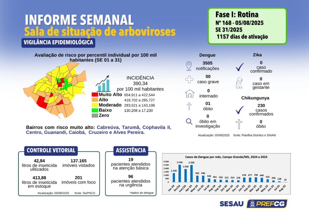 Segundo o Informe Semanal nº 168 da Sala de Situação de Arboviroses, referente à Semana Epidemiológica 31 (27/07 a 02/08/2025), Campo Grande registrou 3.505 notificações de dengue no ano, sem casos graves, com um óbito confirmado e 95% dos focos localizados dentro das residências. Para chikungunya, foram 230 casos confirmados, sem óbitos. Não houve registro de zika no período. Entre os bairros com risco muito alto estão Cabreúva, Tarumã, Cohpavila II, Centro, Guanandi, Caiobá, Cruzeiro e Alves Pereira. As ações de controle vetorial resultaram na vistoria de 137.165 imóveis e aplicação de 42,84 litros de inseticida. A SESAU reforça que a prevenção também passa pela vacinação: a campanha contra a dengue está disponível para o público-alvo nas unidades de saúde da capital, sendo fundamental para reduzir casos graves e hospitalizações.