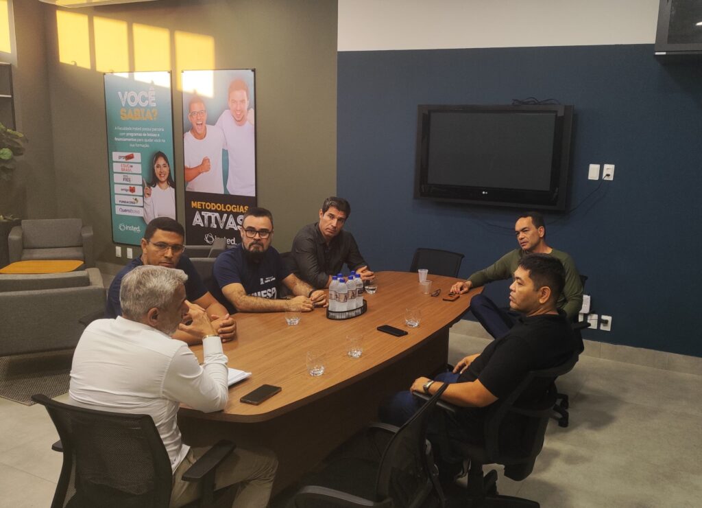 #ParaTodosVerem A foto interna mostra reunião feita anteriormente entre representantes da Funesp e Faculdade Insted. Eles estão sentados em volta de uma mesa oval.