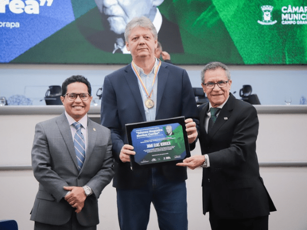 Na Sessão Solene de Outorga da Medalha Legislativa “Afonso Nogueira Simões Corrêa”, em comemoração aos 50 anos da Embrapa Gado de Corte, realizada pela Câmara Municipal de Campo Grande nesta segunda-feira (18), o vereador Epaminondas Vicente Neto, o Papy, presidente da Casa de Leis, homenageou o secretário Jaime Verruck, titular da Secretaria de Estado de Meio Ambiente, Desenvolvimento, Ciência, Tecnologia e Inovação (Semadesc).