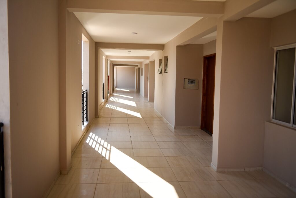 As unidades possuem 33,70 m², com sala integrada à cozinha, área de serviço e quarto com banheiro adaptado às normas de acessibilidade. Corredores amplos, elevadores e escadas de emergência completam a estrutura pensada para oferecer conforto e segurança.