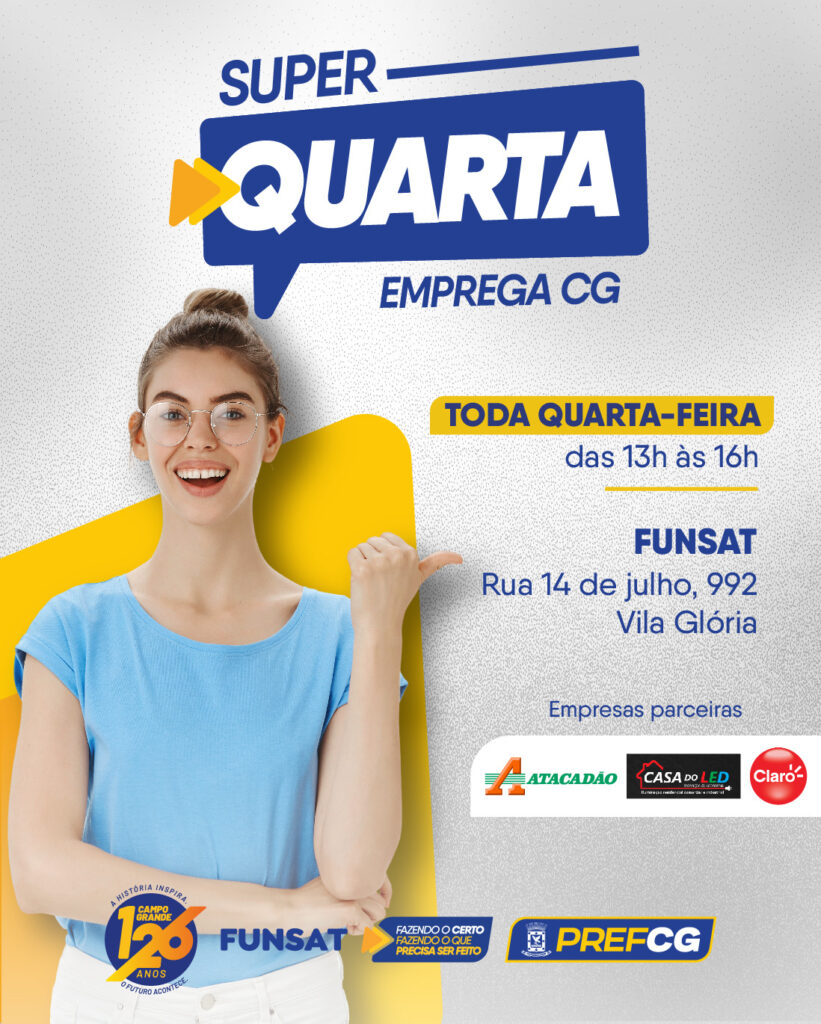 Nesta tarde, das 13h às 16h, acontece mais uma edição do Emprega CG – Super Quarta, que chega à sua 49ª realização. A ação contará com a participação das empresas Atacadão, Casa do LED e Claro, oferecendo pelo menos 150 vagas exclusivas com análise imediata de candidatos.