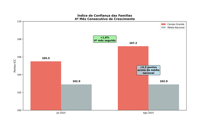 Outro indicador relevante foi o Índice de Confiança das Famílias, que atingiu 107,2 pontos em agosto, superando a média nacional em 4,3 pontos e registrando o quarto mês consecutivo de crescimento. O resultado reflete maior otimismo dos consumidores em relação à renda, ao consumo e às perspectivas profissionais, reforçando a solidez da economia local.