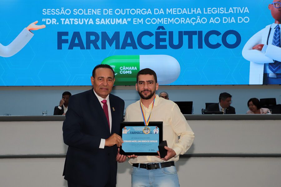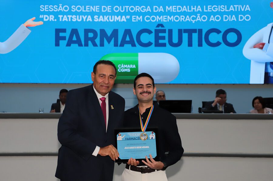 O vereador Carlos Augusto Borges (Carlão PSB), homenageou aos farmacêuticos Júlio Augusto Bueno Miranda e Fernando Maciel, na noite desta quarta-feira, dia 24, em Sessão Solene realizada pela Câmara Municipal de Campo Grande. Durante o evento, o vereador Carlão entregou a “Medalha Legislativa Dr. Tatsuya Sakuma”, em reconhecimento aos serviços prestados pelos profissionais. A solenidade foi proposta pelo vereador Dr. Jamal e instituída pela Resolução n. 1.334/20.
