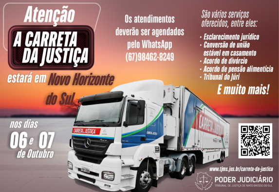 A Carreta da Justiça, unidade móvel do Tribunal de Justiça de Mato Grosso do Sul, iniciará a próxima semana na cidade de Novo Horizonte do Sul, onde oferecerá diversos serviços jurídicos de forma gratuita para a população local nos dias 6 e 7 de outubro. Os atendimentos à comunidade serão realizados no Ponto de Inclusão Digital (PID) do município, localizado na Av. João Sobrinho, nº 589, Centro.