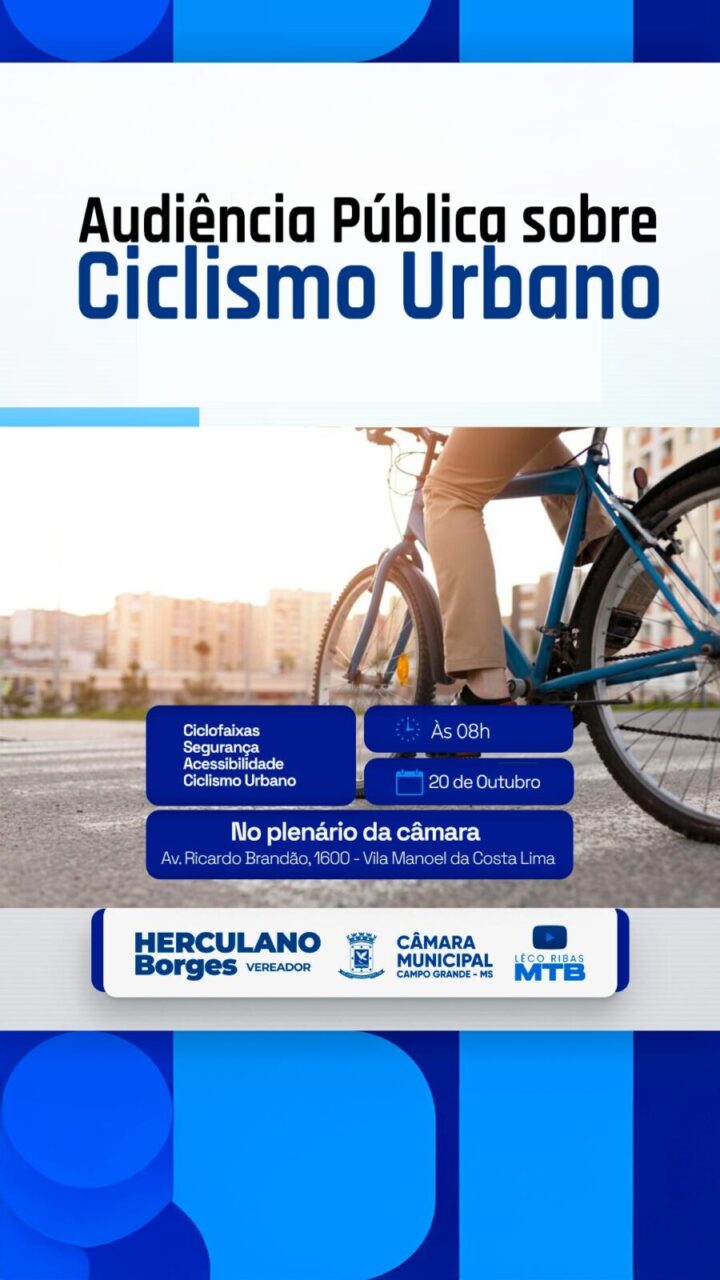 Com o objetivo de debater políticas públicas voltadas à mobilidade urbana sustentável, o vereador Herculano Borges realiza, no próximo dia 20 de outubro, a Audiência Pública sobre Ciclismo Urbano. O encontro acontece a partir das 8 horas, no Plenário da Câmara Municipal de Campo Grande (Av. Ricardo Brandão, 1600 – Vila Manoel da Costa Lima).
