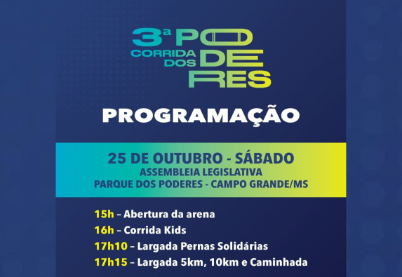 A terceira edição da Corrida dos Poderes será realizada neste sábado, dia 25 de outubro, em Campo Grande, e promete movimentar o fim de semana na capital sul-mato-grossense. O evento celebra o Dia do Servidor Público, promovendo esporte, cidadania e solidariedade ao mesmo tempo em que reforça a união entre os poderes e a comunidade.