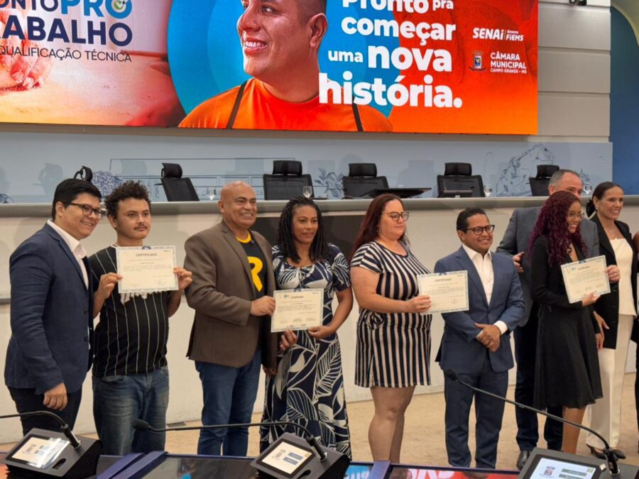 A certificação de 554 trabalhadores marcou a conclusão da primeira etapa do projeto Pronto Pro Trabalho, parceria entre a Câmara Municipal de Campo Grande e o Senai/Fiems para ampliar a qualificação profissional. Presidente da Comissão Permanente de Indústria e Comércio da Câmara, o vereador Ronilço Guerreiro tem atuado diretamente na articulação do programa e reforça que a iniciativa responde a uma demanda urgente do setor produtivo, que hoje convive com mais de 30 mil vagas abertas no Estado.