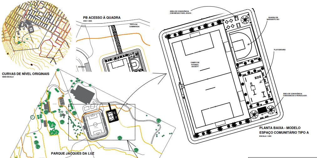 O projeto segue o modelo de Espaço Esportivo Comunitário Tipo A e Tipo B, com área total de aproximadamente 3 mil metros quadrados, priorizando lazer, esporte e convivência comunitária. Entre os equipamentos previstos estão: